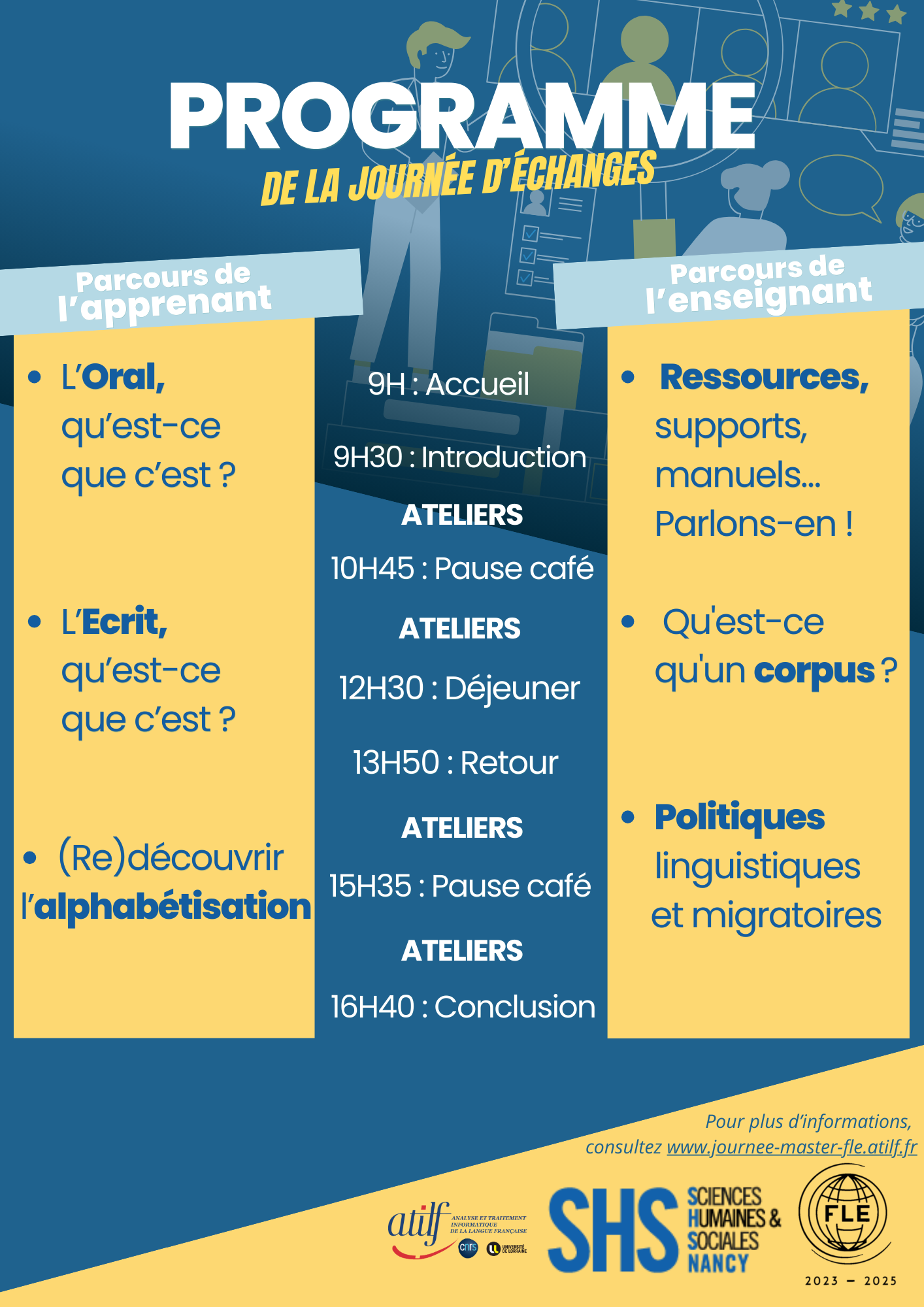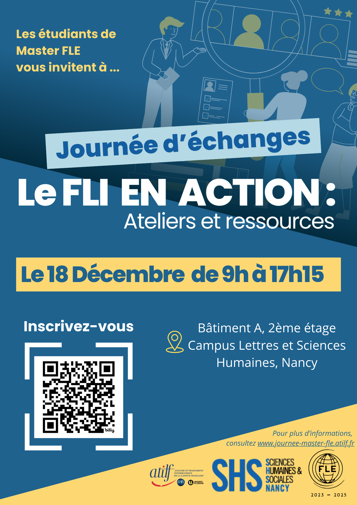 Les étudiant·e·s du Master 2 Français Langue Étrangère (FLE) de l’Université de Lorraine (Nancy), vous invitent à participer à une journée d’échanges le mercredi 18 décembre 2024 sur le Campus Lettres et Sciences Humaines de Nancy de 9h à 17h15. Cette rencontre vise à mettre en commun l’expérience d’enseignement de bénévoles en FLE, et une réflexion contemporaine sur de nouvelles façons d’aborder la formation linguistique d’un public migrant (Français Langue d’Intégration, ou FLI).